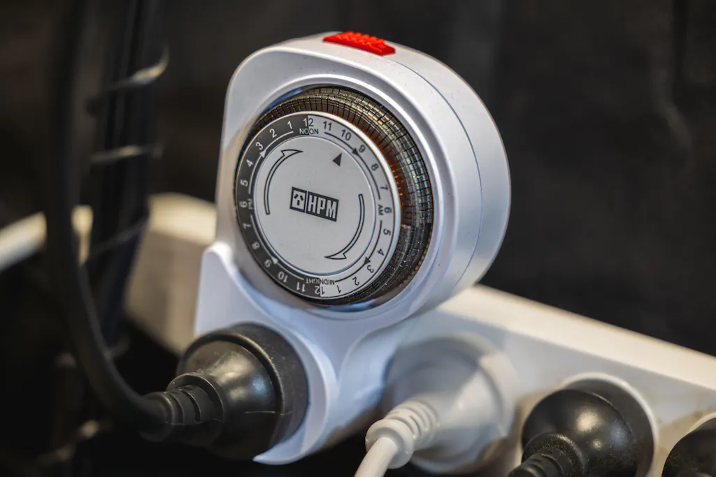 24-hour mechanical timer switch for cycling any equipment on/off each day.When reliability and simplicity come together, a mechanical timer is a result. These timers have proven to cycle equipment with heavy electrical loads multiple times every day without fault for years on end. No complicated digital settings could risk messing up a critical light cycle.Simply push the tabs in around the timer plug dial for a set amount of run time and rotate the dial to match the current time. Easy as that.